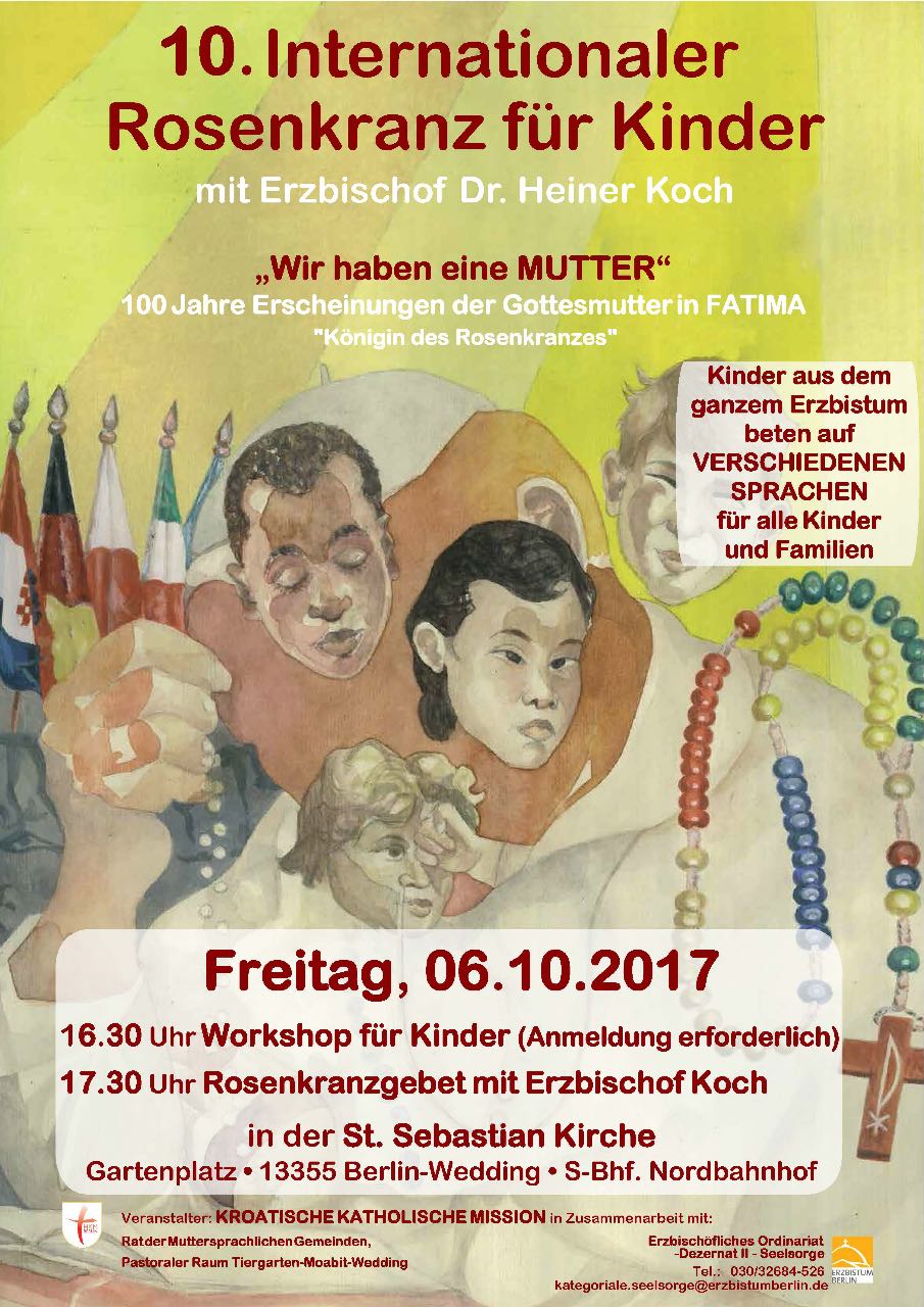 Berlin/ U crkvi svetog Sebastiana je večeras, u petak, 06.10.2017. godine, 1o. po redu Internacionalna krunica. Tim povodom, upućen je iz Misije poziv djeci i roditeljima.