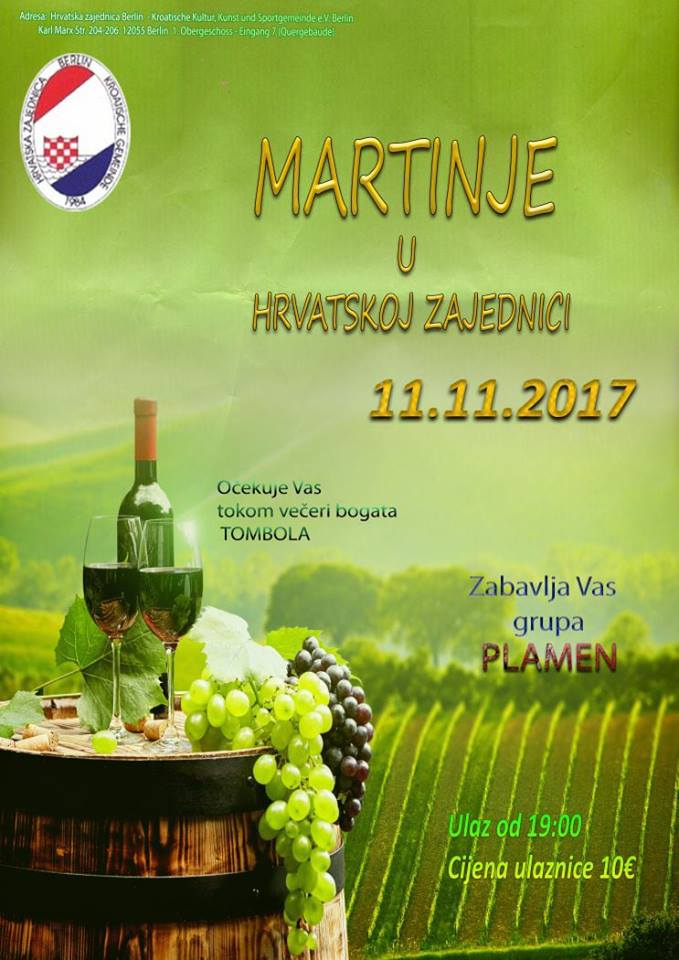 Berlin/ Hrvatska kulturno-umjetnička i sportska zajednica Berlin e.V. organizira tradicionalnu Martinjsku zabavu, u subotu, 11.11.2017. godine u 19 sati.