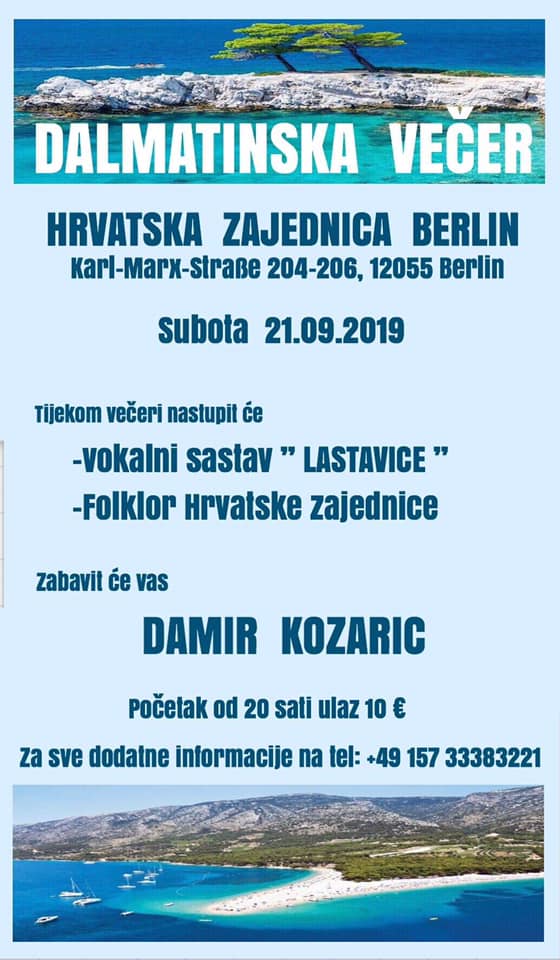Berlin/ Hrvatska kulturno-umjetnička i sportska zajednica Berlin organizira u subotu, 21.09.2019. tradicionalnu zabavu naslova “Dalmatinska večer”.