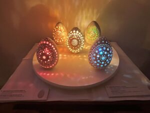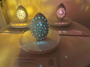 Dijana Nazor Čonda: “Ova izložba je prije Berlina bila u Etnogarfskom muzeju u Zagrebu i u Galeriji grada Krapine. Ovdje ima dvadesetak novih radova, tu su elementi lepoglavske čipke, infra red pisanice, pisanice s glagoljicom… Svakom novom izložbom radim i dodajem nove radove, obogatim ju novim detaljima. Ovo je do sad najveća izložba pisanica. Napravila sam ovu izlužbu jer jako volim ukrase za Uskrs i željela sam napraviti nešto originalno. S obzirom da sam bila dvije godine na tečaju keramike usudila sam se napraviti nešto novo, najprije perforirane pisanice a onda sam ih kombinirala sa svjetlom. Taj element svjetla je dao poruku i magičnost. Svaka žaruljica je ručno oslikana, malo umjetničko djelo, poput male katedrale, instalacija koja ima svoju priču pogotovo jer je vezana za hrvatsku baštinu. Ta je baština i ključni element zašto sam ja ovdje. Hrvatska se želi jače predstaviti sa svojom baštinom. Nakon Berina dogovorena je izložba u Muzeju grada Samobora i vjerojatno u Rimu“, rekla nam je simpatična umjetnica koja je u Berlinu svoju eksponate predstavila noseći haljinu s motivima, detaljima fotografija pisanica, posebno načinjena za ovu izložbu čime, kako je objasnila, nastoji uspostaviti sklad s izložbenim motivima i cijelim ugođajem nastalim u kombinaciji keramike, svjetla i ugodne glazbe.