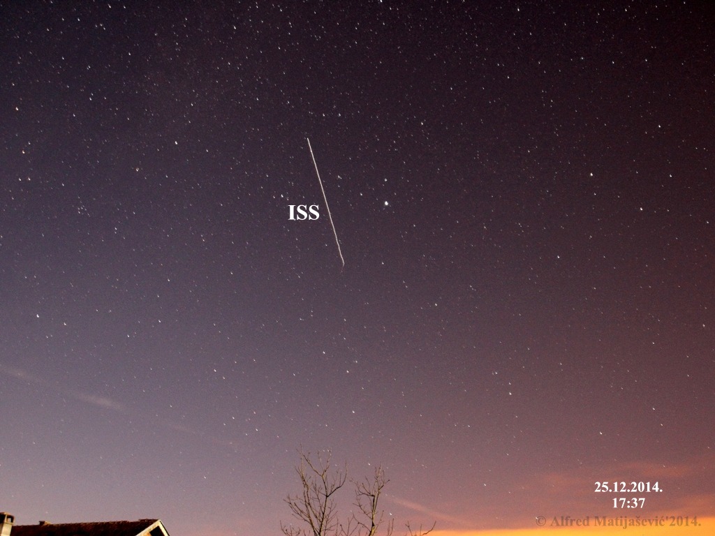 Večerašnje božićno predvečerje … sunce se odavno skrilo iza horizonta; vedro nebo okupano u milijunima svjetala, dobi još jedno svjetlo, koje bijaše najsvjetlije – naime međunarodna svemirska stanica, ISS, preletjela je iznad naše domovine i nestala na istočnome horizontu nakon svega šest minuta (na ovoj snimci vidljiv je trag od 25 sekundi leta).…