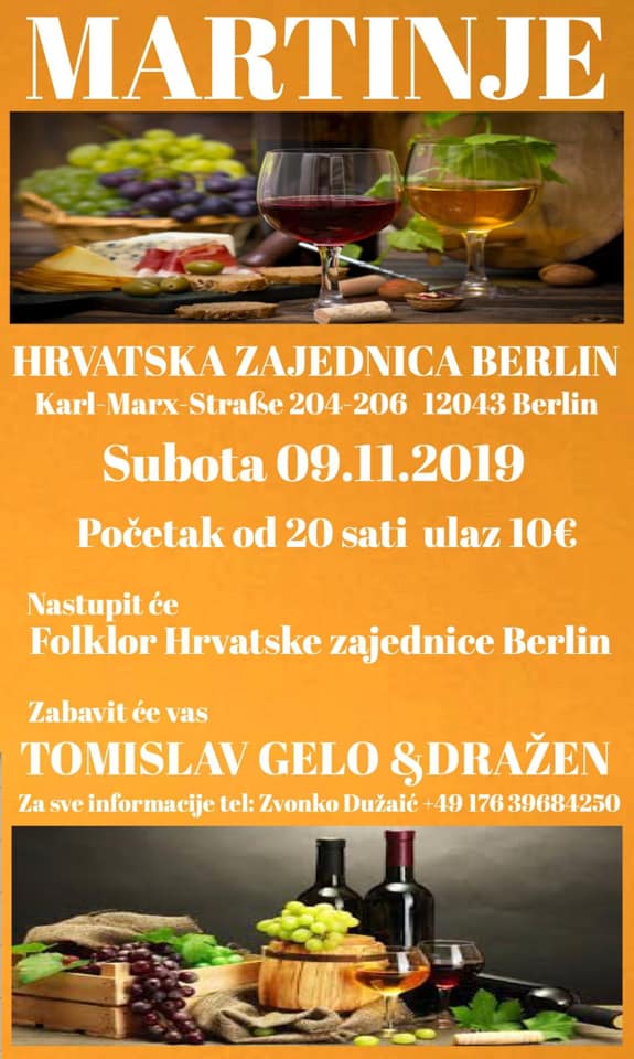 Berlin/ Hrvatska kutlurno-umjetnička i sportska zajednica Berlin organizira tradicionalnu proslavu Martinja u subotu, 09.11.2019. s početkom od 20 sati.