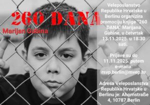 Berlin/ Veleposlanstvo Republike Hrvatske u Njemačkoj odaslalo je pozivnicu za promociju romana “260 DANA”, autora Marijana Gubine, u četvrtak 13. studenog 2025. godine, s početkom u 18:30 sati.