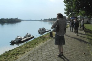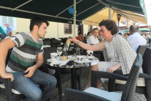 Na trećoj slici je u jednom od brojnih brodskih kafića na korzu u razgovoru sa kolegicom Dunjom Vanić iz Posavske Hrvatske.