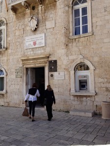 Još nije počela predsezona pa samo jedan kafić ima svoje stolove na Narodnom trgu. Ovo je u biti i najljepše doba za obići Trogir i uživati u kavici na ovom doista posebnom mjestu, bez gužve koja prati ljeto. Još uvijek se iznenadim cijenom šalice kave uz koju za razliku od one naručene u Belgiji dobiješ i besplatnu čašu vode. A, cijena je 10 kuna, znači euro i pedeset centi. Kavica na sličnom mjestu – povijesnoj jezgri bilo kojeg srednjovjekovnog grada u Belgiji je najmanje 3 eura. I to bez vode koju naravno platiš još 3 eura.