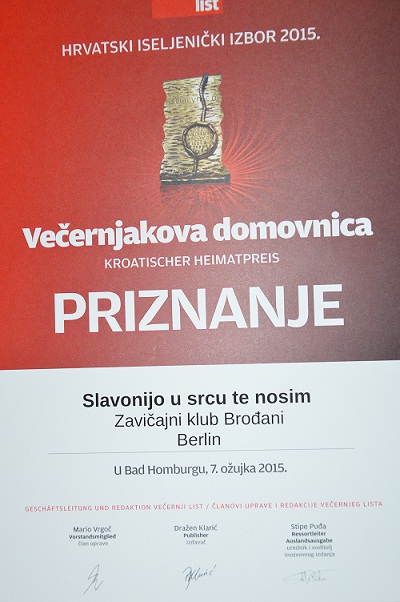 Večernjakovu domovnicu 2015. u kategoriji događaj godine, dobila je i zabava “Slavonijo u srcu te nosim” u organizaciji Zavičajnog kluba “Brođani” Berlin.