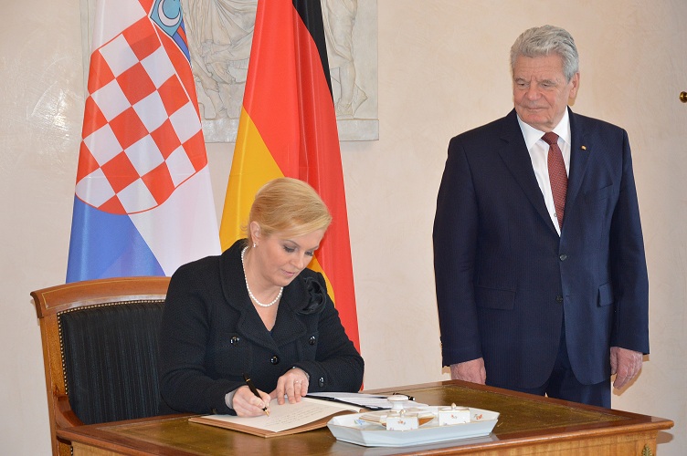 Njemački predsjednik je izrazio dobrodošlicu i zadovoljstvo da može pozdraviti hrvatsku predsjednicu. –Naše dvije zemlje su vrlo povezane, rekao je, između ostalog Gauck. Povezani smo i s preko dvije stotine tisuća građana Njemačke hrvatskog porijekla. Oni značajno doprinose njemačkom gospodarstvu i društvu uopće. Mnogi od njih su ovdje pronašli domovinu. Povezani smo i brojnim njemačkim građanima koji kao turisti posjećuju Hrvatsku.
