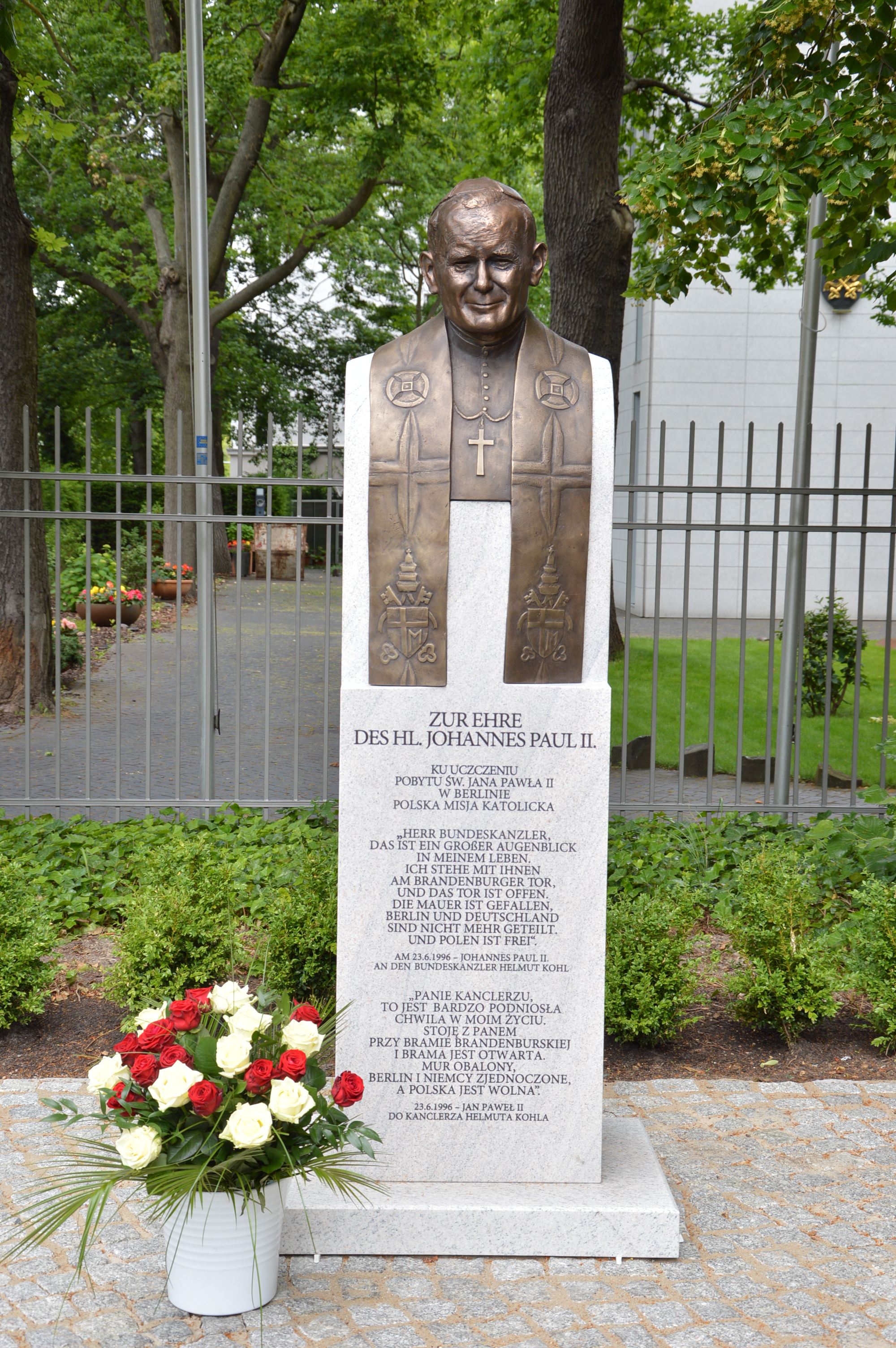 Berlin/ Ispred bazilike svetog Ivana, sjedišta Poljske katoličke misije gdje se, dok traje renoviranja crkve st Bonifacija, održavaju i nedjeljne mise na hrvatskom jeziku, postavljena je 23. lipnja 2015. godine, bista Ivana Pavla II.