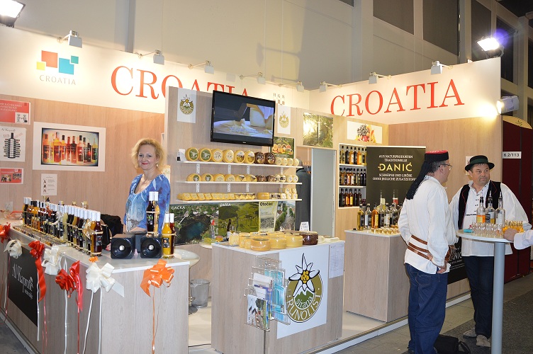 Na hrvatskom štandu, iako je već pokasno i iza njih je naporan dan, ugodno ozračje. Evo nas da pozdravimo stare poznanike- upornog Gorana Đanića iz Podgorača, vlasnika obrta za tradicionalnu poljoprivredu i proizvodnju kojemu je ovo već deveti nastup na Zelenom tjednu i čiji su proizvodi rakije, juliške, kruškovca i pelinkovca, u originalnim pakovanjima, već prepoznatljivi.