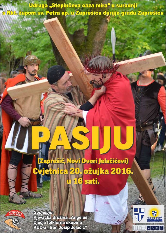Stoga vas drage prijateljice i prijatelji, prijatelji prijatelja, pozivam u ime udruge “ Stepinčeva oaza mira” dođite i uživajte u uprizorenju “Pasije” u Zaprešiću, 20.travnja 2016.god u Jelačićevim Novim dvorima.