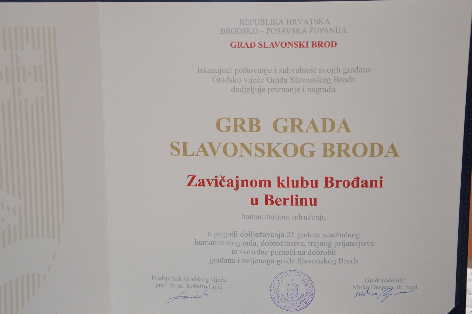 Grb Grada Slavonskog Broda dodijeljen je dekanu Fakulteta za odgojne i obrazovne znanosti prof. dr. sc. Damiru Matanoviću, Vinku Anušiću, Veleučilištu u Slavonskom Brodu, tvrtki Saint Jean Industries, te našim dragim „Berlinčanima“ – Zavičajnom klubu ‘Brođani u Berlinu’, u prigodi obilježavanja njihovih 25 godina nesebičnog humanitarnog rada, dobročinstva, trajnog prijateljstva te svesrdne pomoći na dobrobit građana i voljenog im grada Slavonskog Broda.