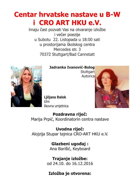Stuttgart/ Centar za hrvatsku nastavu Stuttgart i CRO ART HKU e. V. organiziraju likovnu izložbu Ljiljane Đalok i večer poezije s Jadrankom Ivanović-Bolog u subotu, 22. listopada u 18 sati u prostorijama školskog centra, na adresi Mercedesstr. 3, 70372 Stuttgart/Bad Carnstatt. Pozdravnu riječ će tom prigodom imati Marija Prpić, uvodna riječ: Alojzija Stupar a glazbeni ugođaj: Ana Barišić- keyboard. Izložba ostaje otvorena do 16. prosinca.