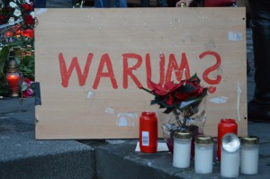 Na više mjesta su polegnute brojne svijeće, cvijeće i pitanje: Warum/Zašto? Ljudi plaču, tješe se, mole, odaju počast preminulima.