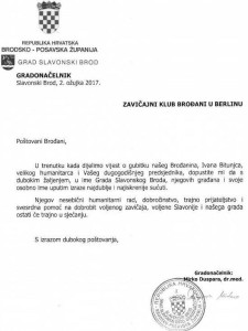 U pismu s nadnevkom: Republika Hrvatska, Brodsko-Posavska županija, Grad Slavonski Brod, Gradonačelnik, Slavonski Brod, 02.03.2017, stoji:
