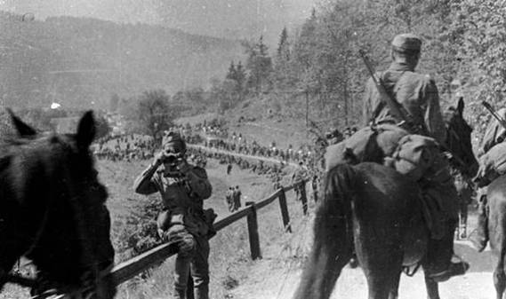 Kolona bojne Ustaške Željezničke vojnice putuje prema Bleiburgu.
