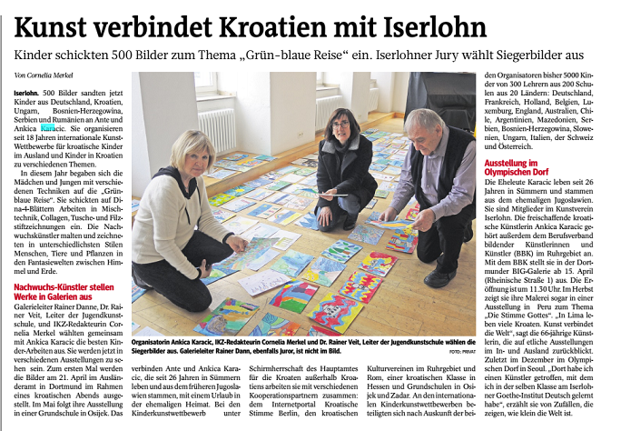 O ovom likovnom natječaju koji je ove godine imao temu “Zeleno i plavo putovanje” i o čijim smo rezultatima nedavno izvijestili, pisali su proteklih dana i njemački mediji. Opširan prilog o organizatorima, natječaju i njegovim sudionicima koji su ove godine načinili i u Iserlohn poslali 500 likovnih radova na zadanu temu rađenih raznim tehnikama, donio je iz pera Cornelie Merkel, svojim čitateljima IKZ-Der Westen.