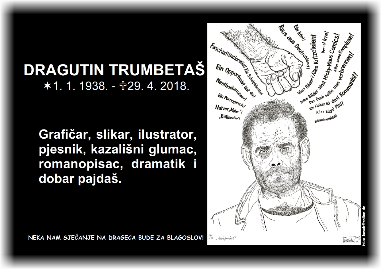 Hrvatska kulturna zajednica će na redovnom susretu u srijedu, 9. 5. 2018. odati i počast preminulom kolegi Dragutinu Trumbetašu, pjesniku, piscu, slikaru i ilustratoru koji je preminuo 29. 04. 2018.