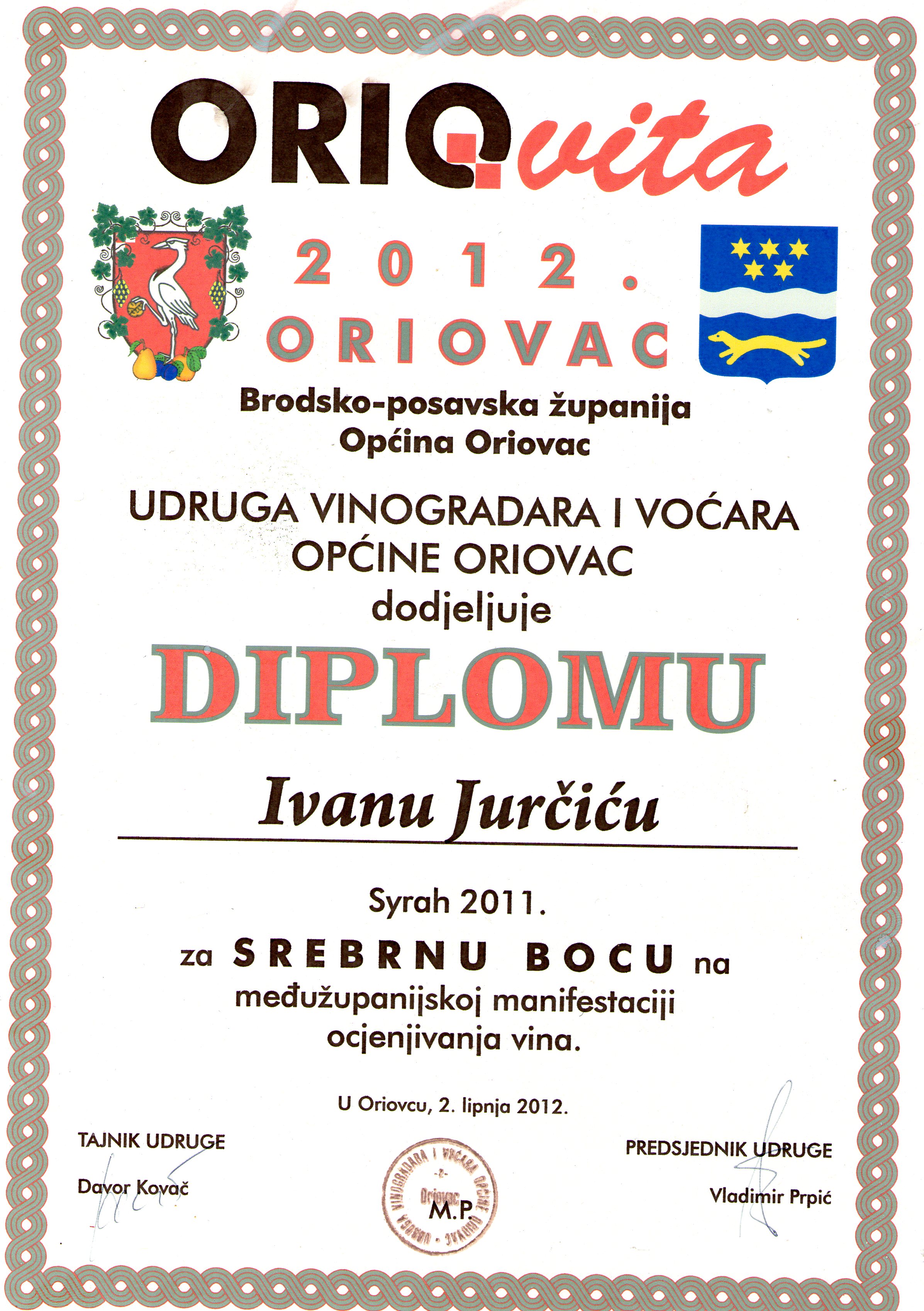 Ove godine sam ja po prvi puta predala vino na Oriovitu i osvojila sam srebro tj.srebrnu diplomu za vino Syrah.Ponosna sam na naš rad i nadam se da če moji sinovi nastaviti tradiciju.