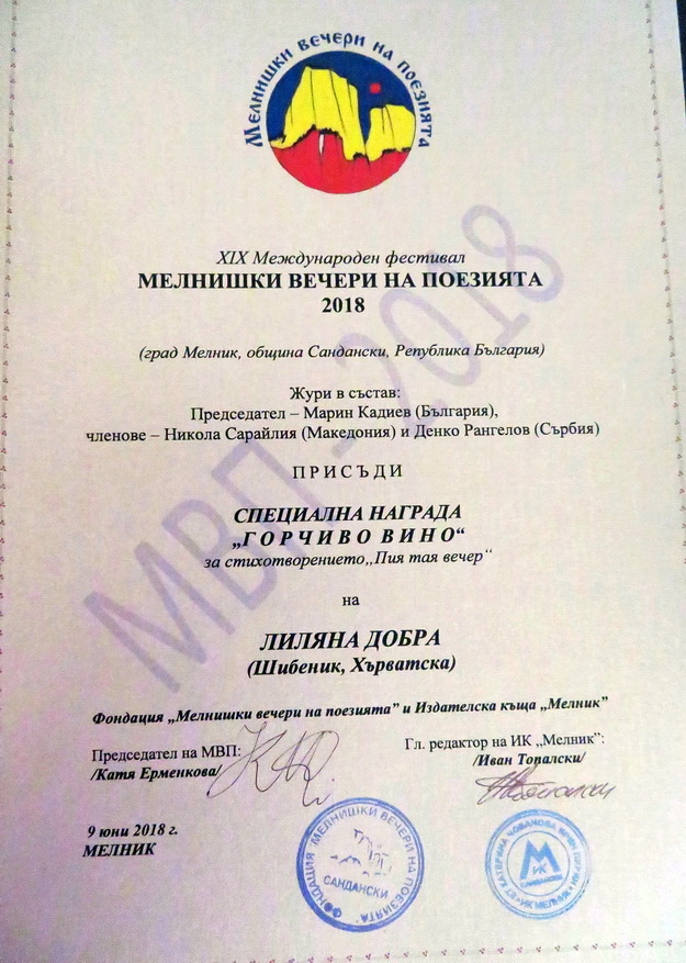 Ja sam napisao i jedan sonet koji je preveden također na bugarski i za to sam dobio specijalnu nagradu koju ću prvom zgodom uokviriti i objesiti na zid.