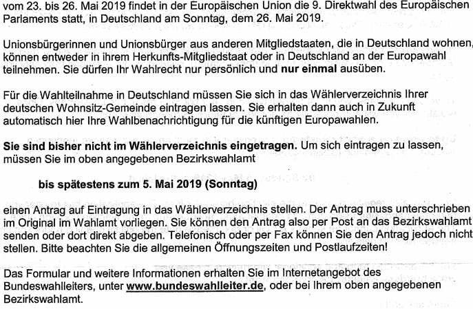 Da bi u općini u kojoj žive u Njemačkoj mogli glasovati, moraju se najkasnije do 05. svibnja 2019 upisati u popis birača.