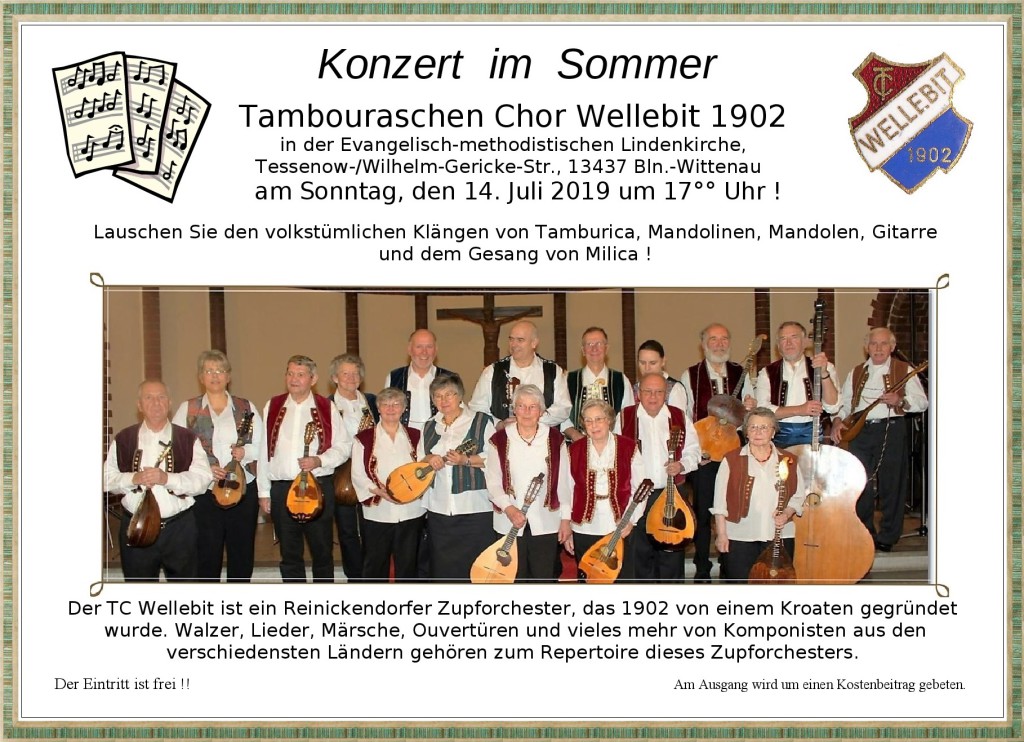 Berlin/ Tambouraschen Chor Wellebit 1902 kojemu je nedavno, za proslave Dana državnosti u Berlinu, uručena Povelja Republike Hrvatske, za značajan doprinos na očuvanju i širenju hrvatske kulture i pozitivnog odnosa prema Hrvatima i Hrvatskoj, najavljuje svoj tradicionali ljetni koncert u nedjelju, 14.07.2019 u 17 sati.