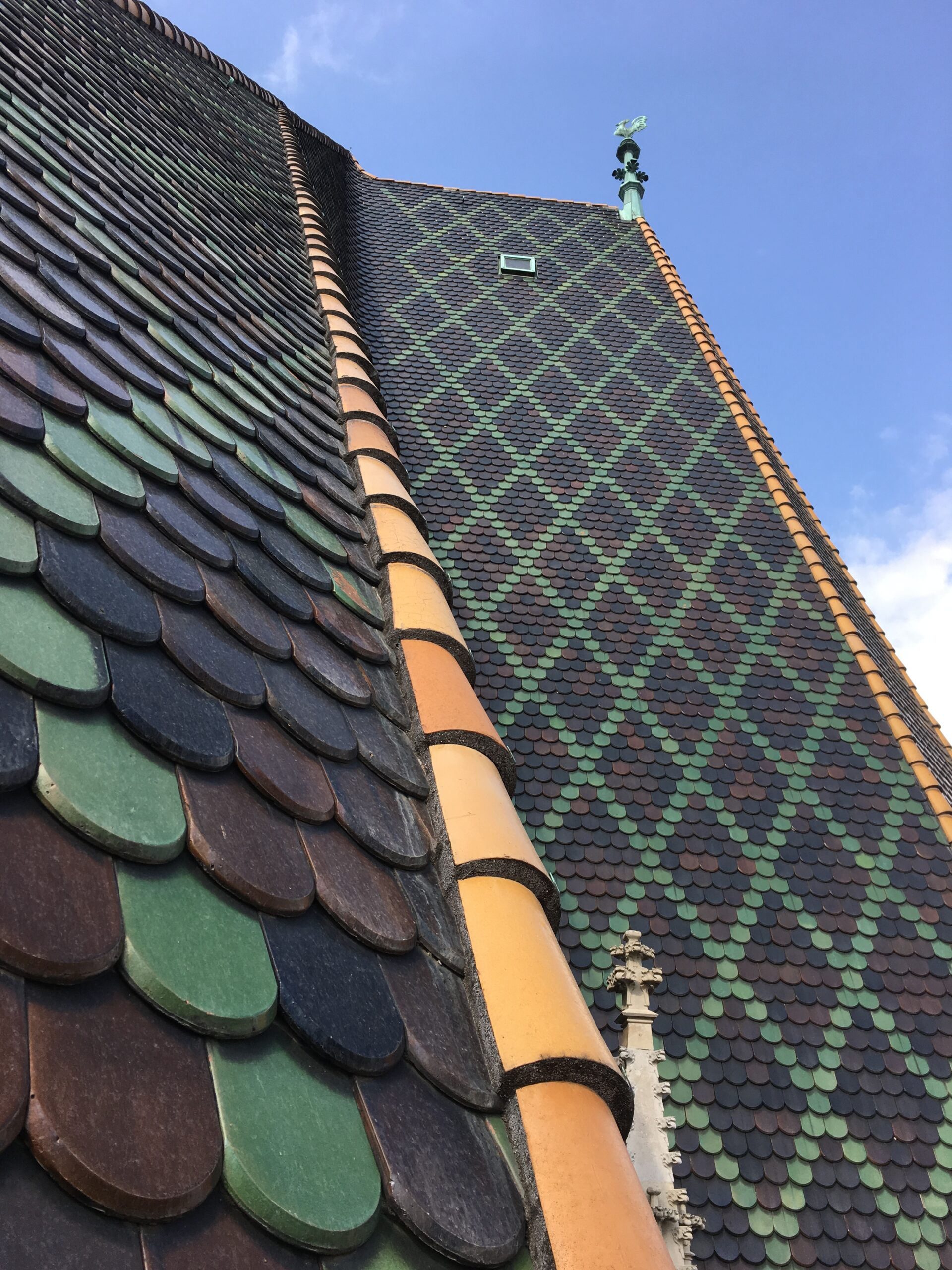 Boraveći u Beču suprug i ja posjetili smo više puta katedralu svetog Stjepana. I to ne samo posjetili nego se zahvaljujući ljubaznosti domaćina popeli do samog krova ove ljepotice, koja je upravo svojim krovom od raznobojnih crijepova odnosno skladno ugrađenih 230 tisuća glaziranih, raznobojnih pločica prepoznatljiv simbol grada. Na krovu su oblikovani pločicama povijesni grbovi, ističe se veliki prepoznatljivi stilizirani, dvoglavi, crni, carski orao. Doznali smo i kako se u potkrovlju čuvaju velike količine rezervnih pločica potrebnih za obnovu krova, a proizvedene su u Češkoj, nekadašnjem dijelu carstva.