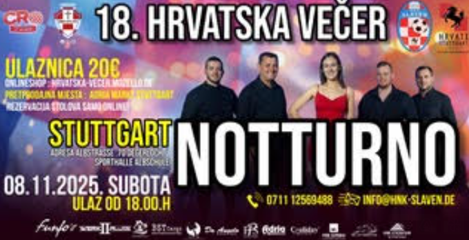 Stuttgart/ HNK Slaven Stuttgart organizira i poziva na 18. po redu Hrvatsku večer u subotu 08. studenog od 18 sati.