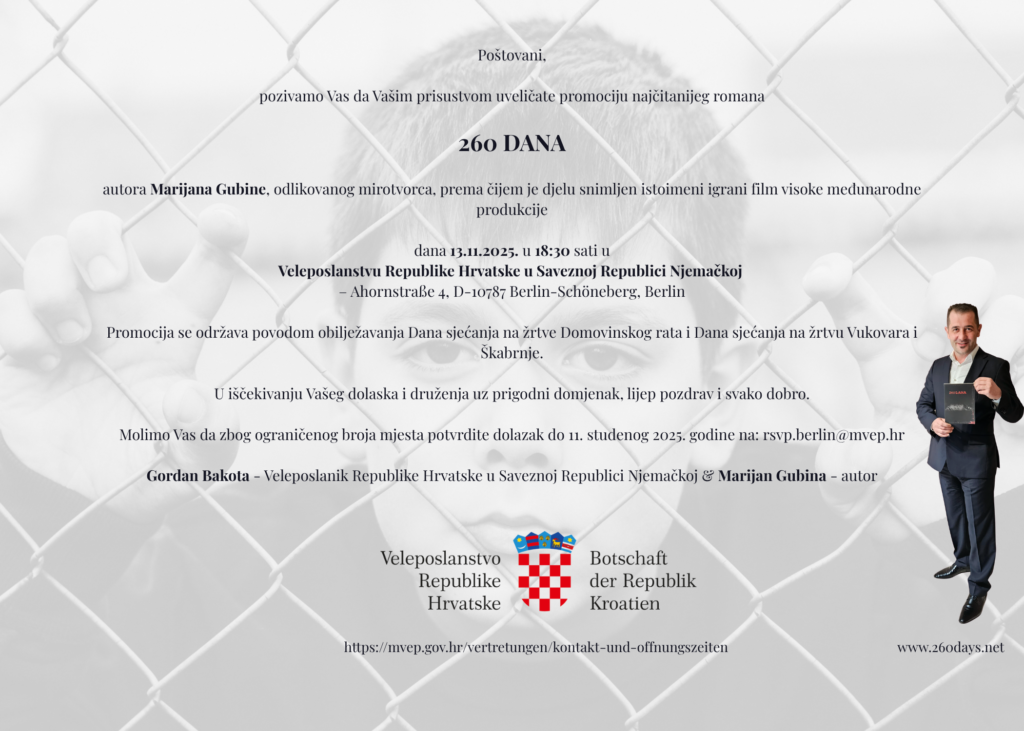 Berlin/ Veleposlanstvo Republike Hrvatske u Njemačkoj odaslalo je pozivnicu za promociju romana “260 DANA”, autora Marijana Gubine, u četvrtak 13. studenog 2025. godine, s početkom u 18:30 sati.