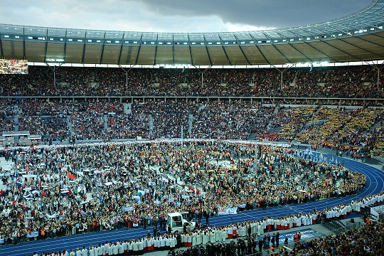 Prava je šteta što u vrijeme izvrsna nastupa Zbora mladih HKM Berlin i razgovora s mladim Hrvatima, Olimpia stadion nije bio sasvim popunjen. Najveći broj posjetitelja tek je pristizao jer su od nastupa zbora nešto iza 16 sati do papina dolaska imala proći još skoro dva sata. Ipak, mladi Hrvati pokazali su kroz glazbu i riječi svoje oduševljenje vjerom. Bili su sretni sjediti za vrijeme mise u redovima za uzvanike odakle je pogled na papu u papamobilu bio sasvim blizu a pogled na više od 60 tisuća okupljenih, uistinu jedinstven.