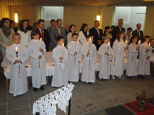 Koblenz/ U nedjelju 6.svibnja, u Katoličkoj misiji Koblenz, bilo je svečano, prepuna crkva a u prvom planu naši prvopričesnici: Anđela, ,Pamela, Ivana, Paula, Ante,Toni, Josip, Kristijan, Karlo i pratnji četiri mala anđelića. Sretni su bili svi a posebno njihovi roditelji. Misno slavlje je predvodio voditelj misije vlč.Stjepan Zadravec, koji je u nadahnutom propovjedi istaknuo važnost njihovog današnjeg velikog dana, značenje za ovaj njihov prvi susret kada primaju Isusa Krista, pristupaju k njegovom stolu i uz nadu da će tako voditi i čitav svoj život.Bili se prekrasni u bijelini, dostajanstveni upravo onakvi kako i dolikuje kada prvi put pristupaju k stolu gospodnjem i postaju punopravni članovi crkve.