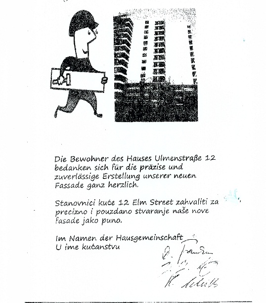Naime, direktor Zorna Andročec izvijestio nas je ukratko: …Zgoda je dobila epilog. Radovi su završeni na vrijeme, a stanovnici zgrade su se pismeno zahvalili našim radnicima, na hrvatskom i njemačkom, te svakom radniku dali i novčanu nagradu iz svog džepa. To nam se nije dogodilo u 22 godine rada tvrtke INGRA-ELTING u SRNJ. To je zbilja izvanredno!
