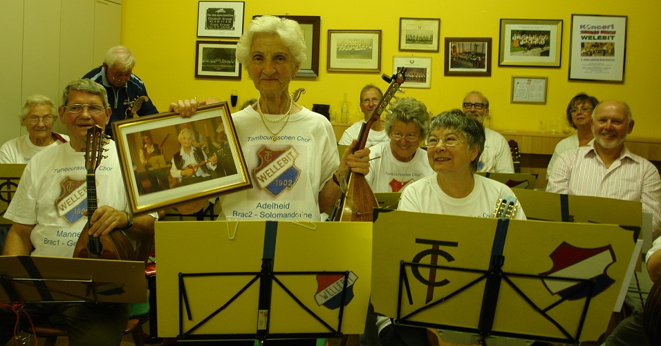 Ma tko je ono rekao da su Nijemci hladni i suzdržani?! Moje riječi je poklopio jaki pljesak i svi su, a posebno 86-godišnja Adelaid, bili vrlo dirnuti. Gospođa Adelaid Saldrow je članica Wellebita od 2002. godine. Profesorica je glazbe, točnije mandoline, i dugi niz godina je, od kako je 1947. doselila u Berlin, radila na glazbenoj školi Tempelhof. U Wellebitu je svirala mandolinu i bisernicu koju su prije koju godinu, dobili na dar od Ministarstva kulture Reepublike Hrvatske. Sad nakon tolikih berlinskih godina, gospođa Adelaid odlazi kćerki …jednoj od blizanki …u Hamburg.-Eto, godine, mora se. Pa naravno, bit će neobično bez Wellebita. Glazba je obilježila moj život, pomogla ostati vitalna tijela i duha, mislim da je za to jako važna. Hvala za divnu fotografiju. Često ću misliti na vas, rekla nam je Adelaid Saldrow, 86-godišnja, vrlo simpatična i draga starica, članica Wellebita.