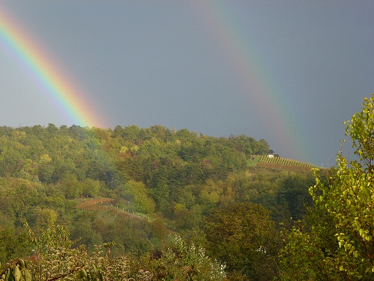Kutjevo/ Možda se i Vama ova fotografija učini zanimljivom. Po prvi sam put u životu vidjela dvostruku dugu, i to iznad vidikovca u Kutjevu. Ovo je tekst Turističke zajednice Požeško-slavonske županije o vili Vinkomir, prikazanoj na fotografijama: “Područje Vinkomira je vjekovima jedno od najboljih pozicija za uzgoj vinove loze u kutjevačkom kraju. Zdenko Turković, jedan od najuspješnijih vlasnika kutjevačkog vlastelinstva, dao je izgraditi spomen-klijet Vinkomir. Građevina je nastala kao kopija osmatračnice iz razdoblja turske vladavine, a i danas izletnicima predstavlja vidikovac sa kojega se pruža prekrasan pogled na Zlatnu dolinu.” I na dugu!