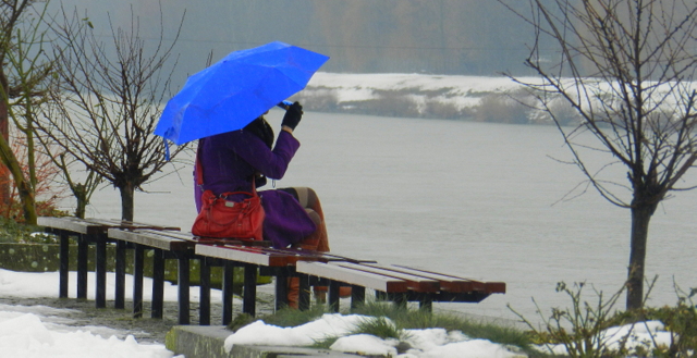 Osijek/ Kiša, maglovito tmurno… u Osijeku sredinom prosinca. Ipak Drava svojom mirnoćom privlači zaljubljenike. Jedan ugodan piknik na njenoj obali u ovom subotnjem prijepodnevu, priuštila si je gospođa na slici.