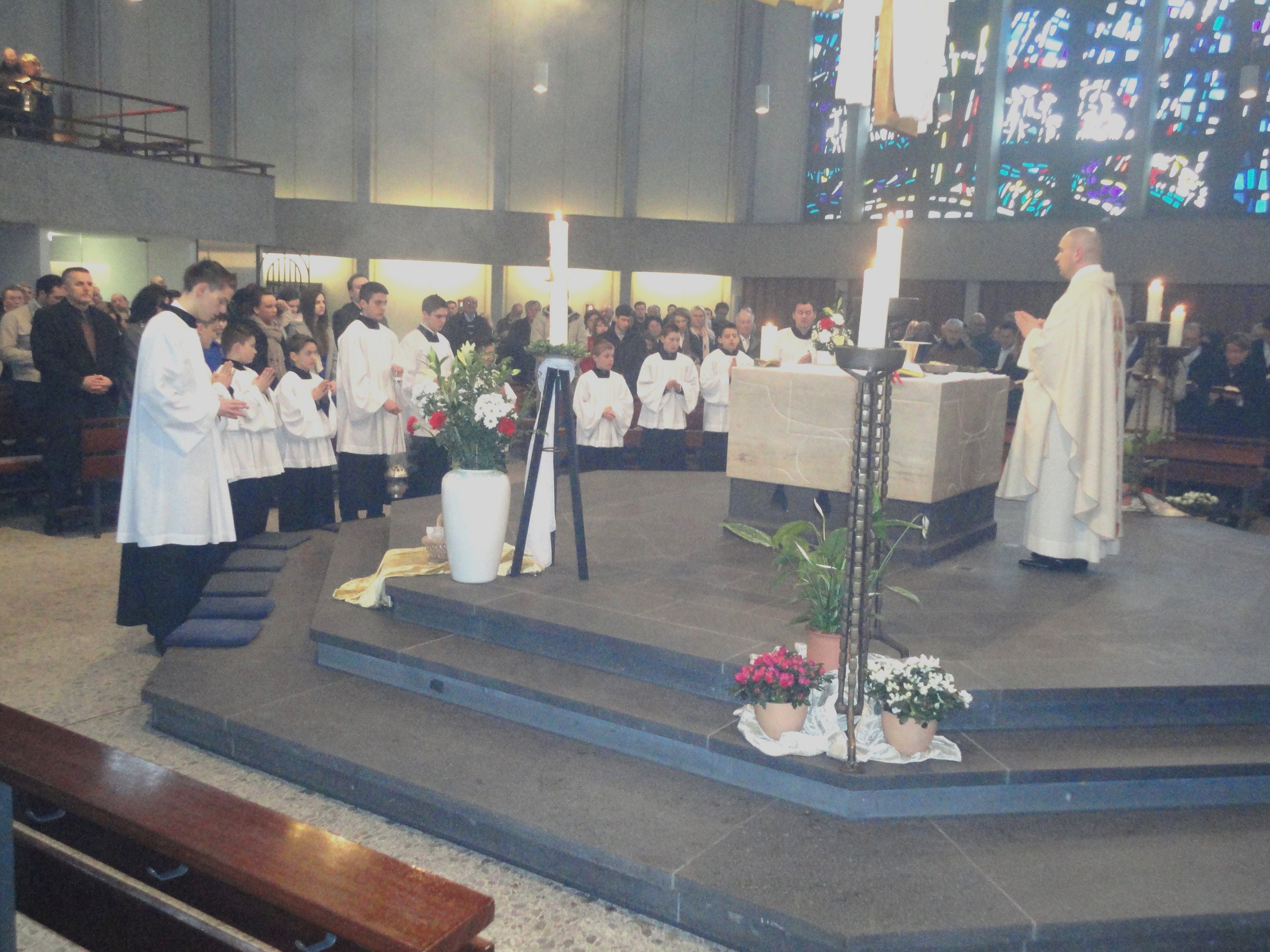 Kao u svim Hrvatskim katoličkim misijama ovdje u Njemačkoj i u našoj u Koblenzu bilo je zaista dostajanstveno upravo onako kako to i dolikuje vjernicima. Veliki četvrtak, Misa Večere Gospodnje. Obredi Velikog Petka, crkva St. Franje dobro ispunjena. Naši ljudi su došli i iz udaljenijih mjesta. Čitanje muke Gospodnje, zatim otkrivanje i ljubljenje križa vratilo nas je bar mislima u crkve svog krštenja. Slijedili je u subotu Vazmeno bdijenje,u dvorištu crkve. Župnik s ministrantima blagoslovi vatru nakon koje s procesijom ulazi u crkvu. Pale se svijeće …lijepi prizor. Mladići Mario i Neno sa svećenikom Stjepanom, čitaju muku.